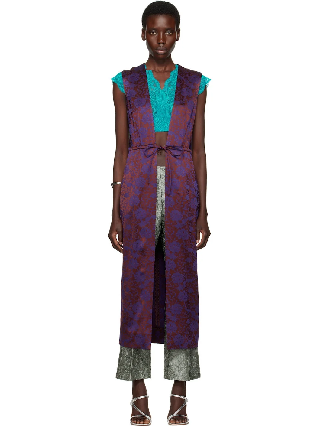 Viscose- and acetate-blend damask vest. Jacquard floral pattern throughout. · Plunging V-neck · Two-pocket styling · Darts at front · Drawstring at waist Supplier color: Burgundy 62% viscose, 38% acetate. Made in Portugal 251358F068002
