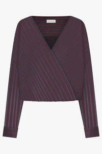 The Camiel Stripe Long Sleeve Wrap Blouse is crafted from 100% cupro and features a subtle striped pattern in burgundy with deep purple and yellow tones. Designed with a cross-over wrap front, the blouse drapes with a slouchy, relaxed fit across the chest and shoulders. Its elasticated ruched waist provides definition, while the long sleeves are finished with button cuffs for a refined detail. Versatile in styling, the piece can be worn both on the shoulders or off for a softer, feminine look. - Fabrication: 100% cupro - Burgundy base with deep purple and yellow subtle stripes - Cross-over wrap front - Slouchy fit across chest and shoulders - Elasticated ruched waist - Long sleeves with button cuffs - Can be styled on or off the shoulders Style with tailored trousers for an effortless day-to-evening look. Size and Fit Tiah: Model is 178cm/5’9” and is wearing a size S Model Measurements: Bust: 86cm, Waist: 69cm, Hips 90.5cm This piece runs generously and can be styled in multiple ways: bloused, tucked, or layered. The fit is intentionally relaxed with a fluid, silky fabrication that moves with the body. We recommend your usual size for a voluminous look, or size down for a closer fit. A discreet bralette or camisole can be added for additional coverage.