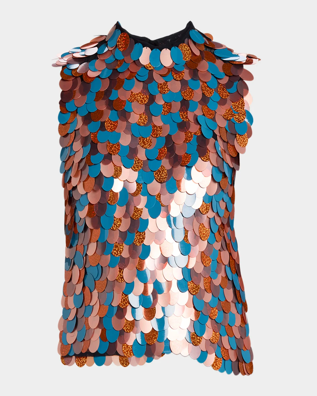 Dries Van Noten "Carmasa" top embellished with multisequins and side cutouts with selftie on the back Round neckline; button/keyhole back Sleeveless Relaxed fit Pullover style Viscose Imported