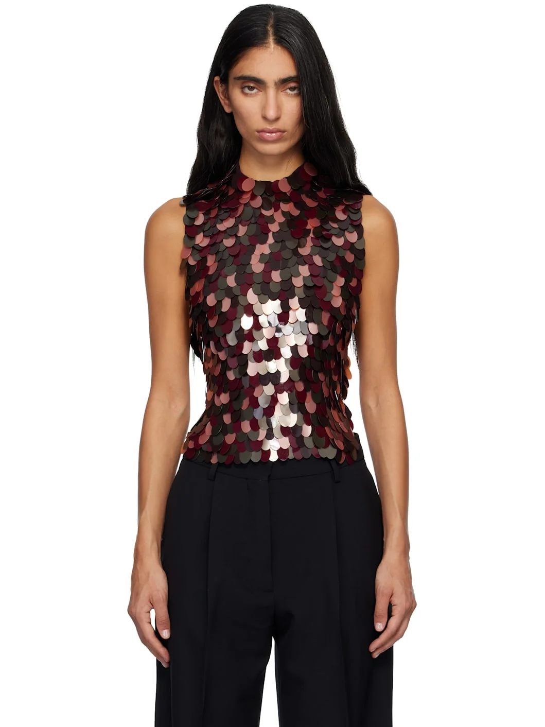 Sequinned viscose mesh tank top. · Crewneck · Self-tie straps at open side seams · Keyhole at back collar Supplier color: Burgundy 100% viscose. Made in India 252358F111018