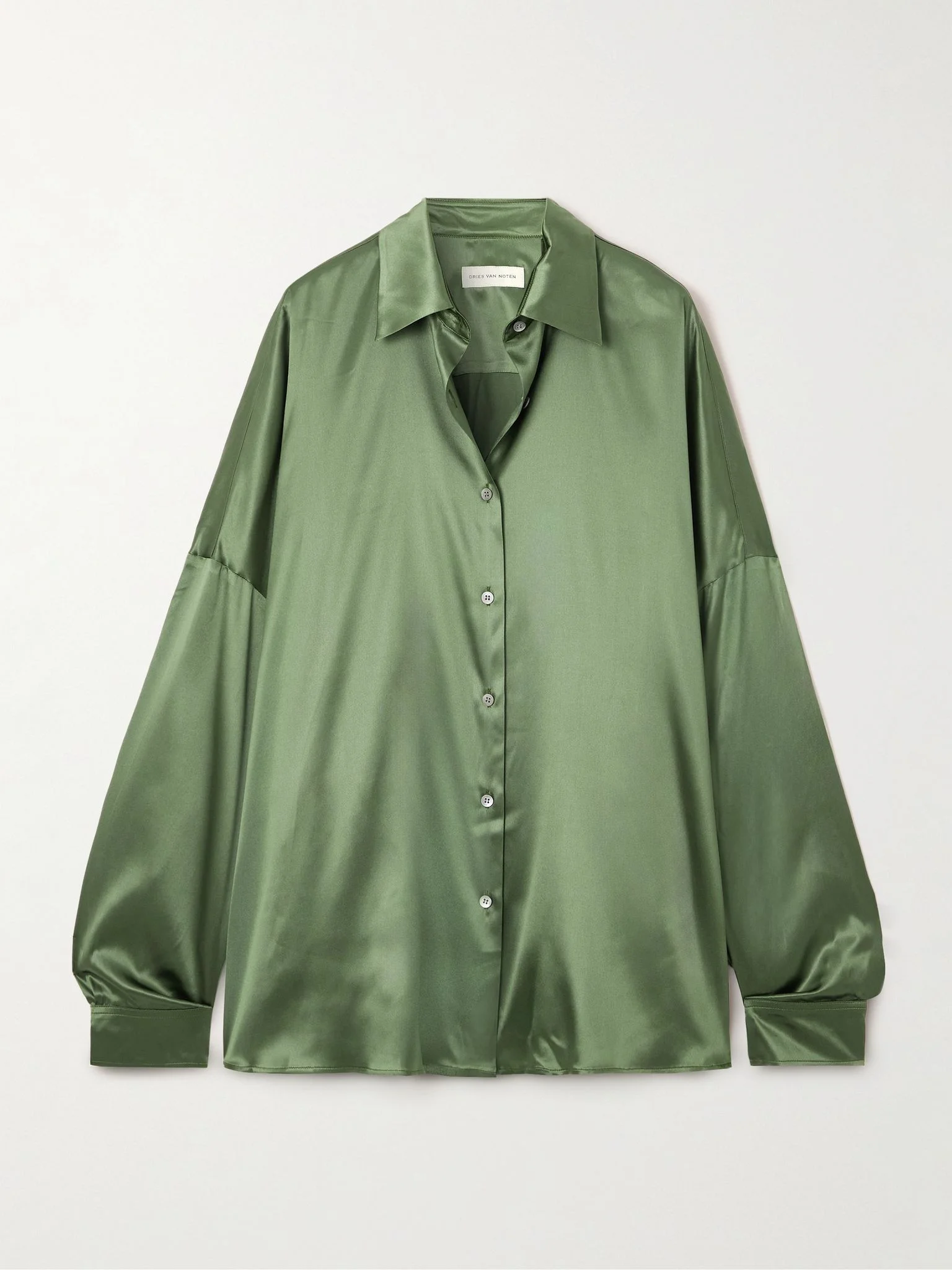 Dries Van Noten's shirt comes in a fresh green shade that'll energize any outfit. Made from lustrous silk-satin, it has an oversized, fluid shape with exaggerated dropped shoulders and fastens with a row of mother-of-pearl buttons. Size & Fit - Intended to be oversized; we recommend sizing down if you prefer a closer fit - Lightweight, non-stretchy fabric - Model is 177cm/ 5'10" and is wearing a size Small Model measurements: - Bust: 80cm/ 31.5" - Waist: 60cm/ 23.5" - Hip: 89cm/ 35" Details & Care - Green silk-satin - Button fastenings through front - 94% silk, 6% elastane - Dry clean - Mother-of-pearl: Indonesia