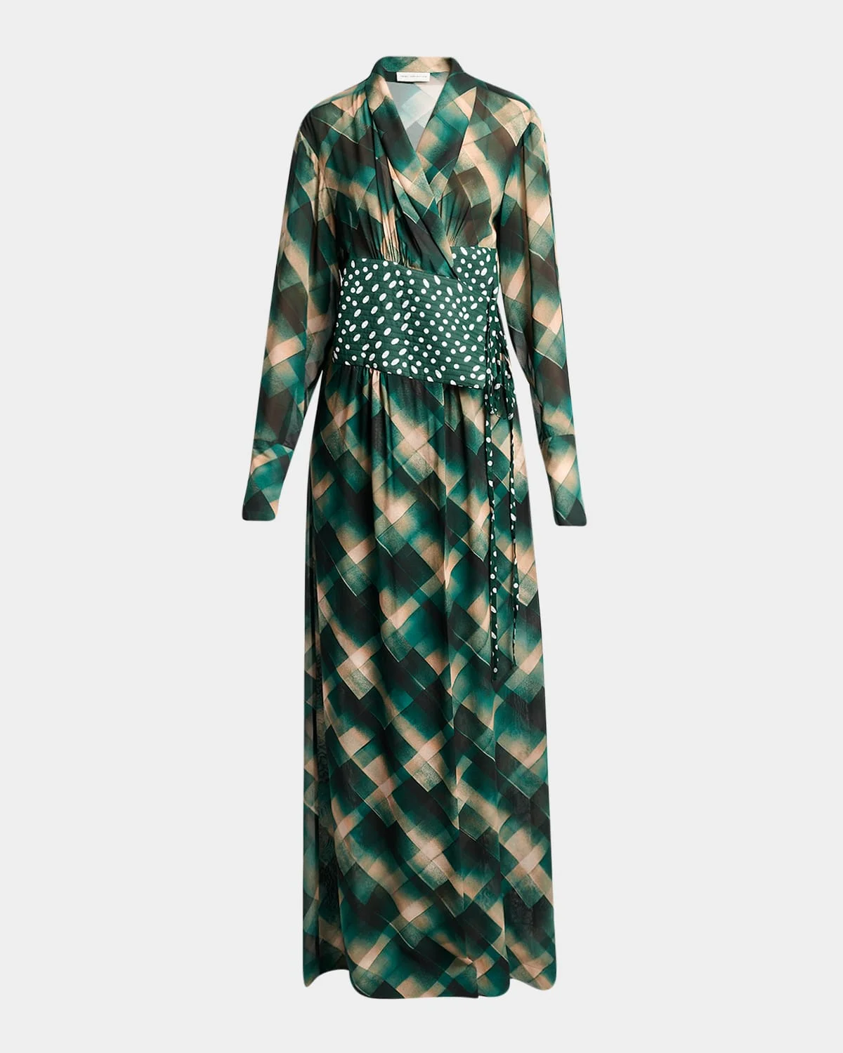 A playful mix of patterns, this shirtdress by Dries Van Noten features a lightweight geometric plaid base accented with pleated, irregular polka dot waist panels Collared Vneckline Long sleeves; button cuffs Full length Relaxed silhouette Selftie side closure Viscose Made in Poland