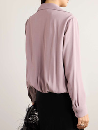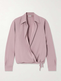 EDITORS'NOTES Dries Van Noten's shirt has a wrap front inspired by pretty ballerina cardigans. It's tailored from crepe, which drapes effortlessly. Layering is key to the label's Fall '24 styling, so try yours under a slim sweater with the cuffs and collar peeking out. SIZE & FIT Model measurements: - Fits true to size, take your normal size - Designed for a loose fit - Drawstring hem for a flexible fit - Mid-weight, fluid, non-stretchy fabric - Model is 180cm/ 5'11" and is wearing a FR 36 - Bust: 80cm/ 31.5" - Waist: 65cm/ 25.5" - Hip: 89cm/ 35" DETAILS & CARE - Pink crepe - Slips on - 73% acetate, 27% viscose - Dry clean - Mother-of-pearl: Indonesia