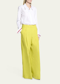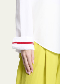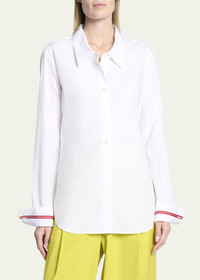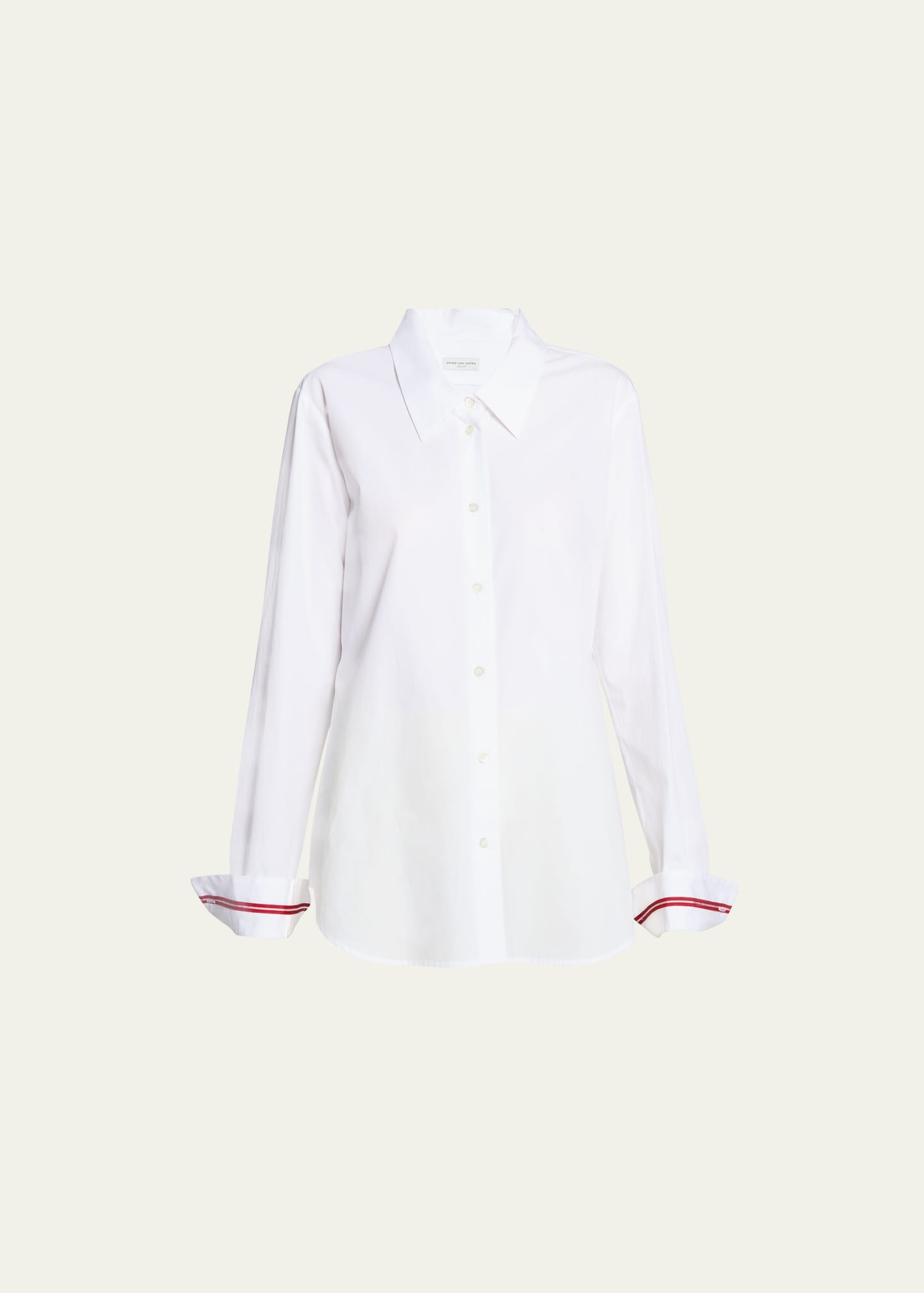 Dries Van Noten "Celina Tape" poplin shirt with contrast cuff taping Point collar; button front Long sleeves; button cuffs Relaxed fit Curved hem Cotton Made in Hungary Model is 5'10"/177cm. Online Inquiries: BGS21_B935N| Store Inquiries: #4732400