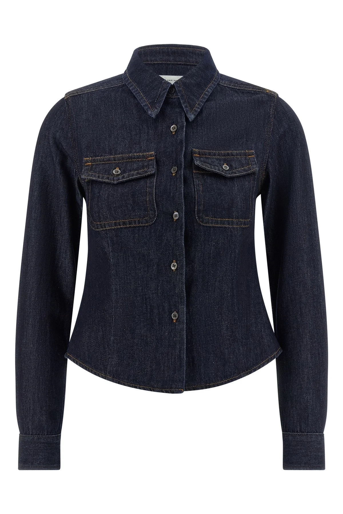 cod. 2611307323385507 'Cellie Den' cotton denim shirt with contrast stitching, slightly cropped style, front pockets, front button closure, long cuffed sleeves. Color: Blue Size & Fit: true to size fit - FRENCH size Composition: 100% cotton Made in: Tunisia