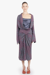 The Dries Van Noten Celsey Layered Floral Motif Blouse in Purple Blue is a sophisticated statement piece that exemplifies the designer’s mastery of color, print, and form. Crafted from lightweight fabric, it features a geometric hexagonal base overlaid with abstract floral motifs in tonal shades of blue, green, and lavender. The fluid drape of the open cowl neckline reveals a contrasting printed underlayer, adding depth and dimension to the silhouette. With long sleeves and a relaxed fit, this piece effortlessly balances bold patterning with refined tailoring, capturing the essence of Dries Van Noten’s artistic elegance. - Fabrication: 100% polyester - Relaxed fit with long sleeves - Layered construction with open cowl neckline and printed contrast insert - All-over geometric and floral motif - Lightweight fabric with a soft, fluid drape Style it with tailored trousers or sleek denim to emphasise the blouse’s sculptural neckline and intricate pattern interplay. Size and Fit Tiah: Model is 178cm/5’9” and is wearing a size FR36 Model Measurements: Bust: 86cm, Waist: 69cm, Hips 90.5cm This style fits slightly big, to sit lower on your waist. Measurements Size 36: Bust 98cm, Waist 94cm, Hip 94cm, Length 64cm Size 38: Bust 100cm, Waist 98cm, Hip 98cm, Length 64cm Size 40: Bust 104cm, Waist 102cm, Hip 102cm, Length 64cm Size 42: Bust 110cm, Waist 104cm, Hip 104cm, Length 64cm