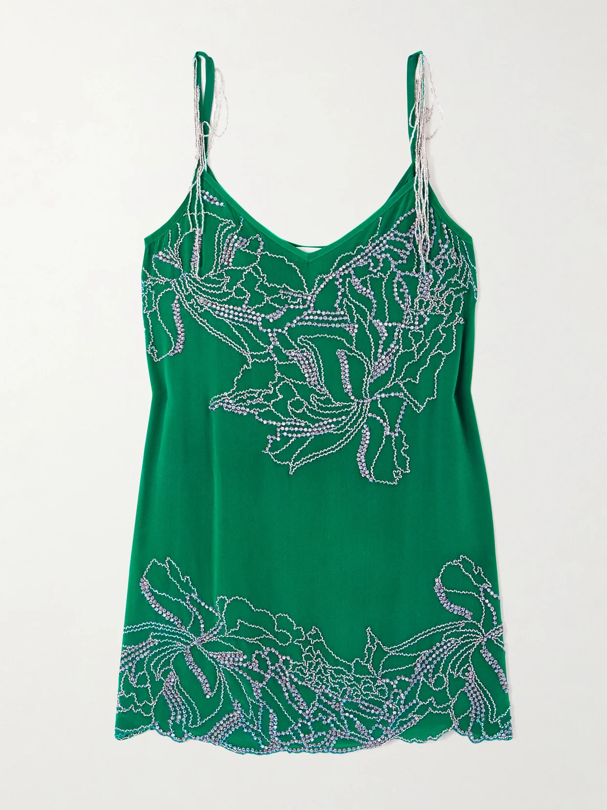 Dries Van Noten's camisole is decorated with tiny beads and crystals arranged in an abstract floral motif outlined by blue embroidery. Made from lightweight silk-crepe, it has a relaxed fit with an asymmetric hem and fringe cascading from the slim straps.
