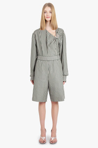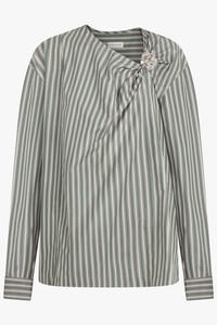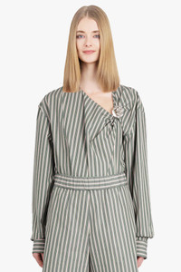 - Striped double twist yarn cotton poplin - Asymmetrical draping - Front knot detail - Long sleeves with buttoned cuffs - Silver shoulder clasp Fabrication: 100% Cotton Size and Fit Sophie: Model is 179cm/5’10” and is wearing a size FR36 Model Measurements: Bust: 76cm, Waist: 61cm, Hips 87.5cm French sizing Designed to be slightly oversized, true to size. Measurements 36: Bust 120cm, Waist 120cm, Hip 120cm, Length 78cm 38: Bust 122cm, Waist 122cm, Hip 122cm, Length 78cm 40: Bust 124cm, Waist 124cm, Hip 124cm, Length 78cm