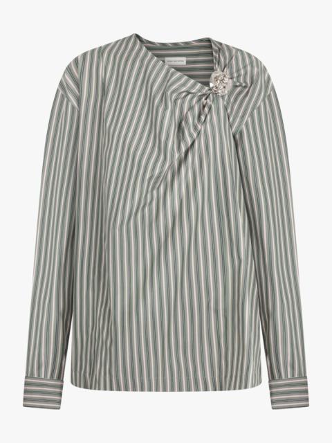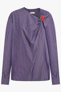 - Striped double twist yarn cotton poplin - Asymmetrical draping - Front knot detail - Long sleeves with buttoned cuffs - Red and silver shoulder clasp Fabrication: 100% Cotton Size and Fit Sophie: Model is 179cm/5’10” and is wearing a size FR36 Model Measurements: Bust: 76cm, Waist: 61cm, Hips 87.5cm French sizing Designed to be slightly oversized, true to size. Measurements 36: Bust 120cm, Waist 120cm, Hip 120cm, Length 78cm 38: Bust 122cm, Waist 122cm, Hip 122cm, Length 78cm 40: Bust 124cm, Waist 124cm, Hip 124cm, Length 78cm