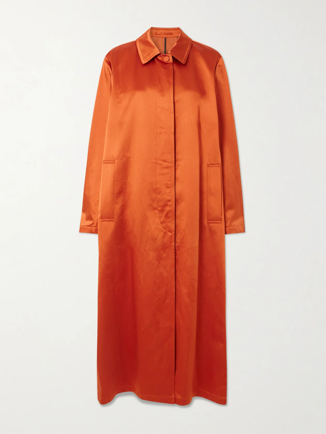 Dries Van Noten believes that your outerwear should be just as luxurious as what you wear underneath it, resulting in statement pieces like this coat. It's cut from cotton-blend satin in a vibrant orange shade and has a loose, longline shape that makes layering so easy. The partially concealed placket ensures a streamlined finish.