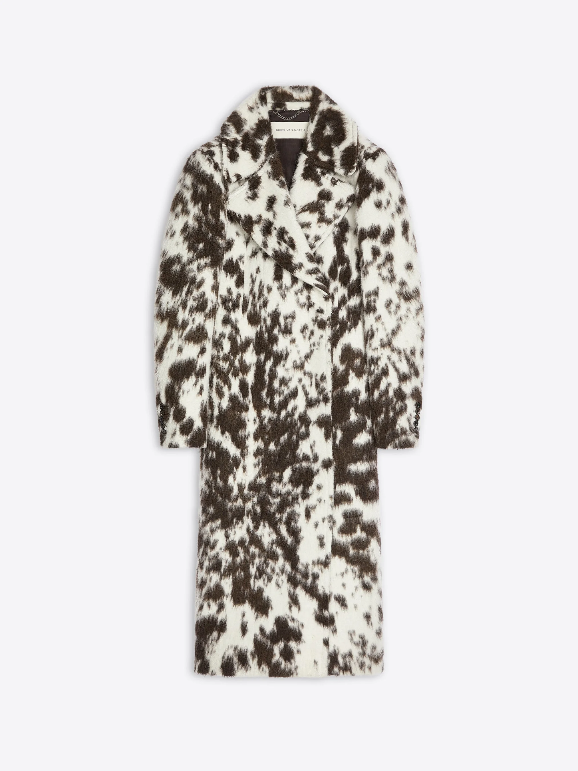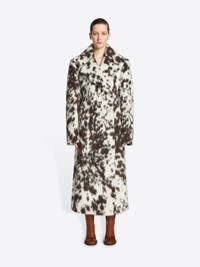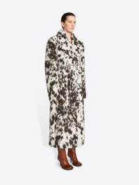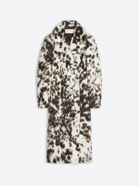 Calf-length coat with constructed padded shoulders in jacquard alpaca wool blend, with tonal cowhide motif. DETAILS - 51% Wool, 19% Polyester, 15% Acrylic, 12% Alpaca, 3% Nylon. Lining: 51% Cotton, 49% Viscose. - Tonal cowhide motif. - Loose fit. Calf length. Padded shoulders. Front slit pockets. Buttoned cuffs. Belted. Hidden front button closure. - Ref: 252-010247-2288 SIZE AND FIT Model is 178 cm / 70 inches and wears size 36.