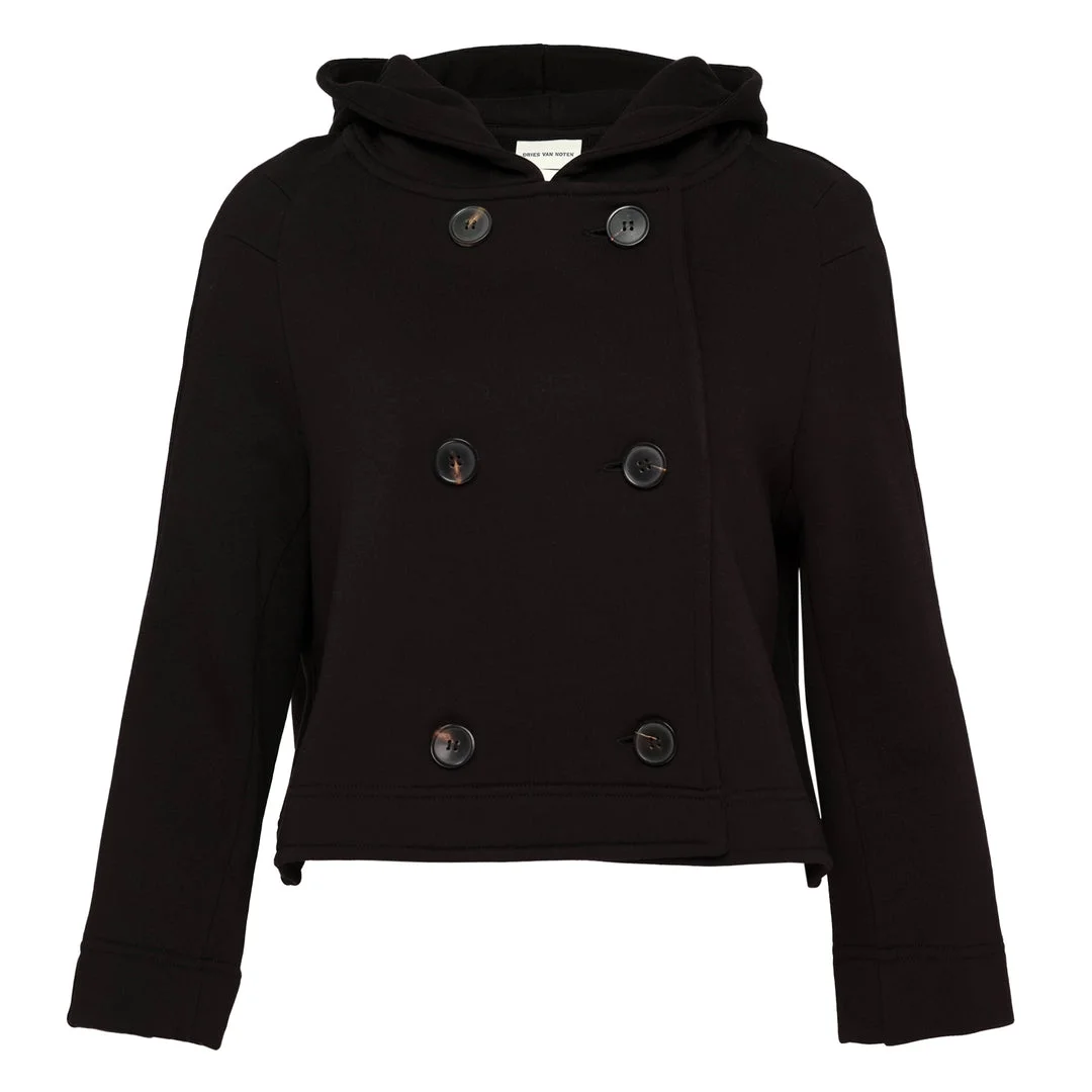 600078676BLK00L / HAVIPA/3610/900 - Double-breasted button closure - Attached hood with drawstring - Six decorative front buttons - Cropped A-line silhouette - Premium wool blend construction - Long sleeves - Structured shoulders The Dries Van Noten Cropped A-Line Jacket delivers sophisticated tailoring with contemporary proportions and architectural silhouette. Crafted from premium wool blend in classic black, featuring double-breasted button closure and structured hood design. The cropped A-line cut and refined Belgian craftsmanship create a modern statement piece for elevated styling.