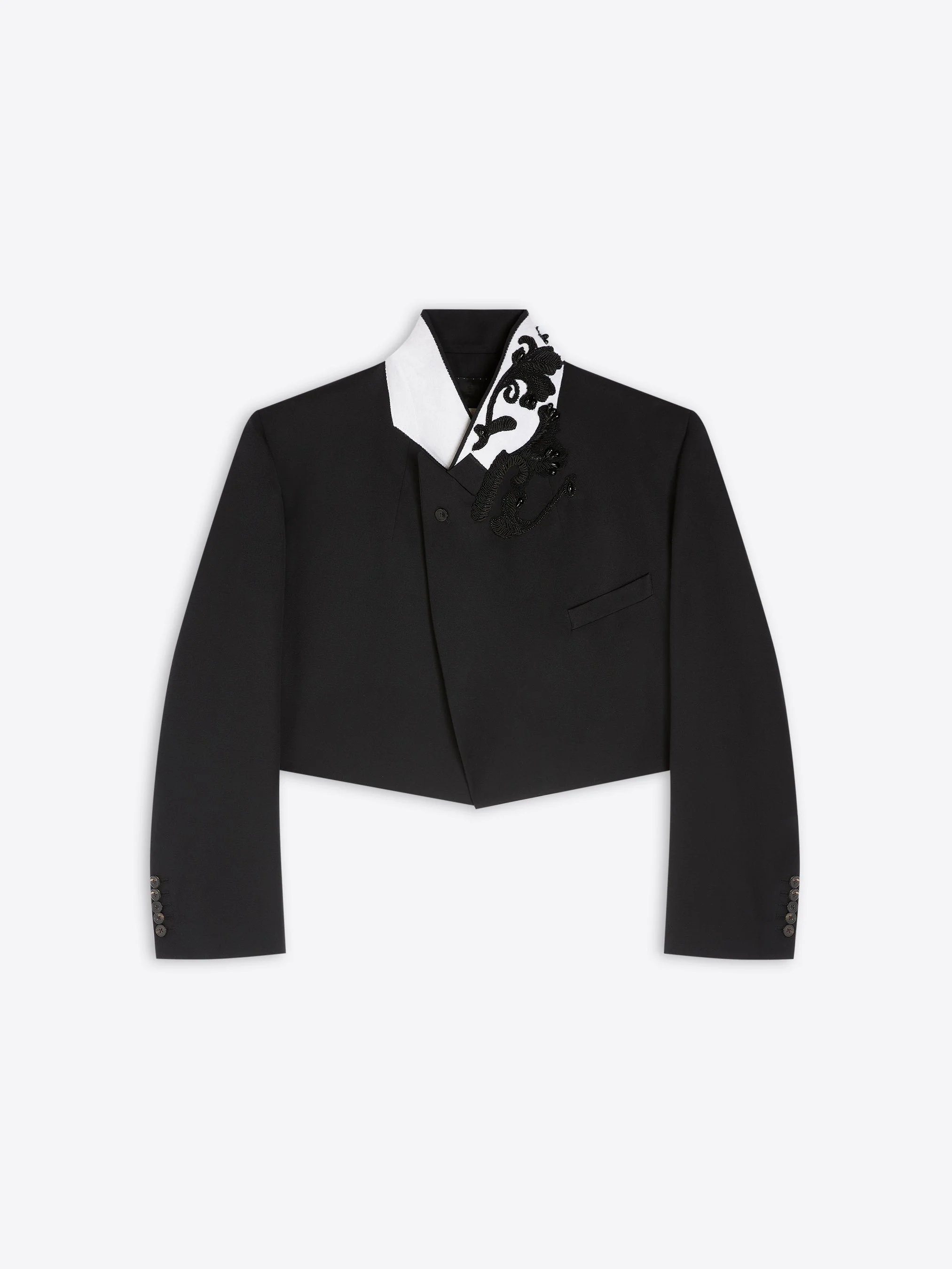 Cropped oversized blazer in virgin wool gabardine, with peak lapel and matador embroidery. DETAILS - 100% Wool. Lining: 100% Cotton. - Contrasting collar with floral embroidery. - Boxy fit. Cropped. Chest welt pocket. Front button closure. - Ref: 261-010419-3122 SIZE AND FIT Model is 178 cm / 70 inches and wears size M.