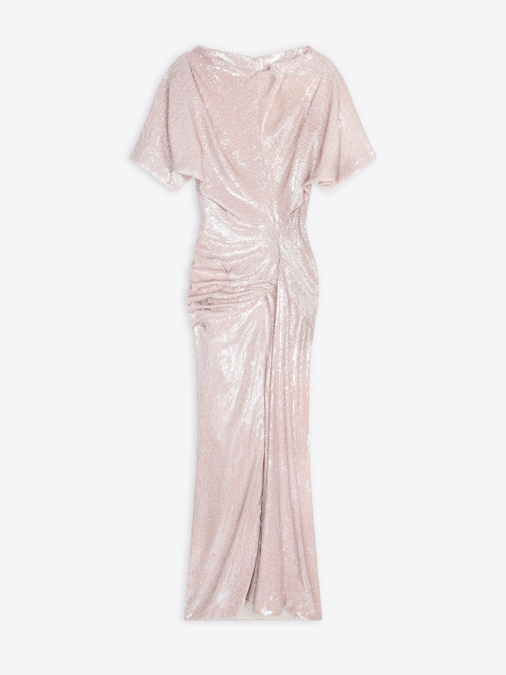 Fitted floor-length draped dress in viscose, with printed sequin embroidery. DETAILS - 100% Viscose. - Printed sequin embroidery. - Tight fit. Floor length. Draped. - Short sleeves. Draped neckline. Back zip closure. - Ref: 242-111033-9321 SIZE AND FIT Model is 180 cm / 71 inches and wears size 34.
