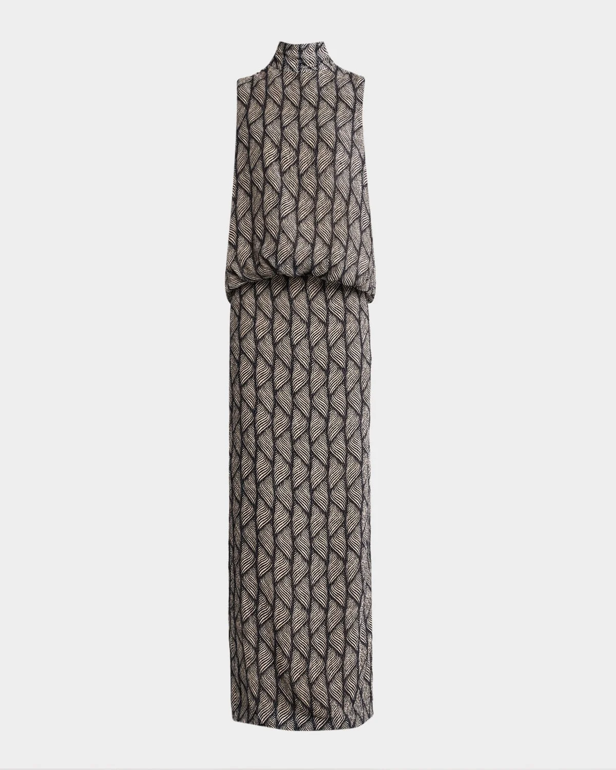 Dries Van Noten "Debo" dress is crafted from an abstract print dotted velvet accented with a cowl draped back cutout and a blouson drop-waist bodice Mock-neckline; button side Sleeveless Column silhouette Floor sweeping hem Slipover style Viscose/silk Lining: Viscose Made in Bulgaria