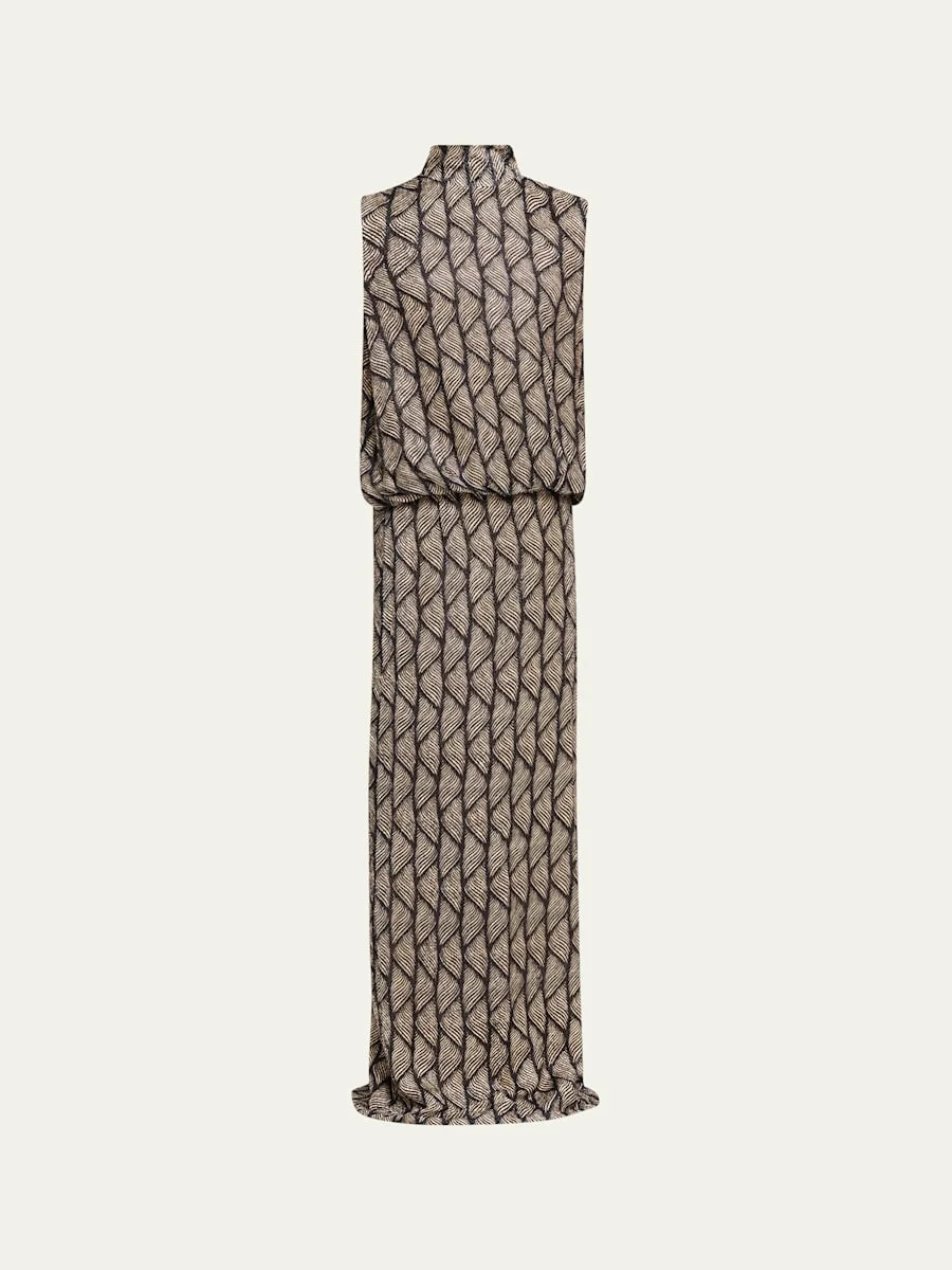 Dries Van Noten "Debo" dress is crafted from an abstract print dotted velvet accented with a cowl draped back cutout and a blouson dropwaist bodice Mockneckline; button side Sleeveless Column silhouette Floor sweeping hem Slipover style Viscose/silk Lining: Viscose Made in Bulgaria