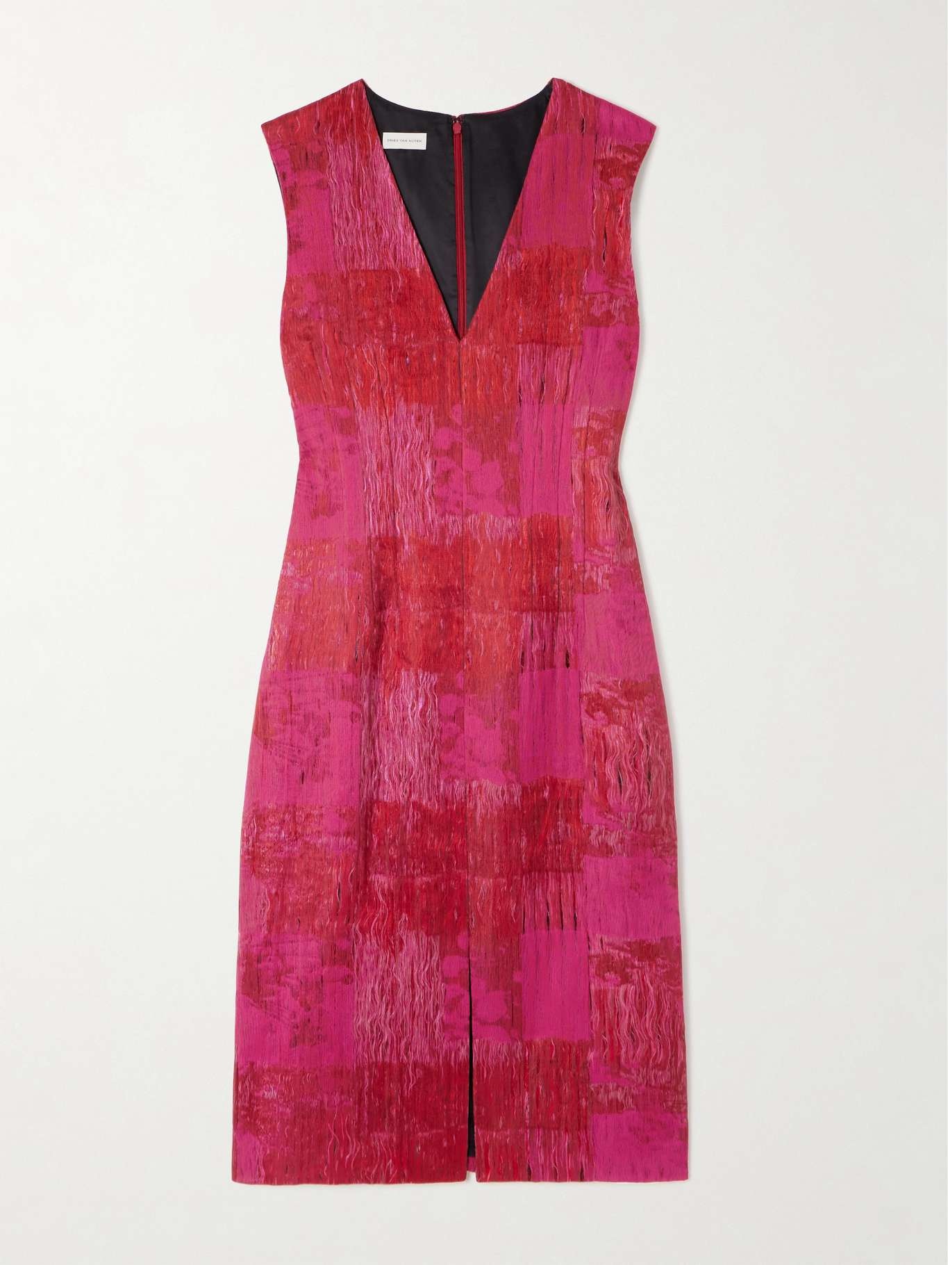 EDITORS'NOTES Dries Van Noten's collections are consistently defined by a spirit of experimentation. This 'Delina' dress is made from a patchwork of cotton-blend panels that are distressed and jacquard-woven with flowers for a tactile finish. It's cut for a slim fit and has a split hem that mirrors the V-neckline. SIZE & FIT Model measurements: - Fits true to size, take your normal size - Designed for a slim fit - Mid-weight, non-stretchy fabric - Model is 177cm/ 5'10" and is wearing a FR 36 - Bust: 80cm/ 31.5" - Waist: 60cm/ 23.5" - Hip: 89cm/ 35" DETAILS & CARE - Fuchsia cotton-blend jacquard - Concealed hook and zip fastening at back - 56% cotton, 22% acetate, 15% polyester, 4% silk, 3% polyamide; lining: 100% viscose - Dry clean