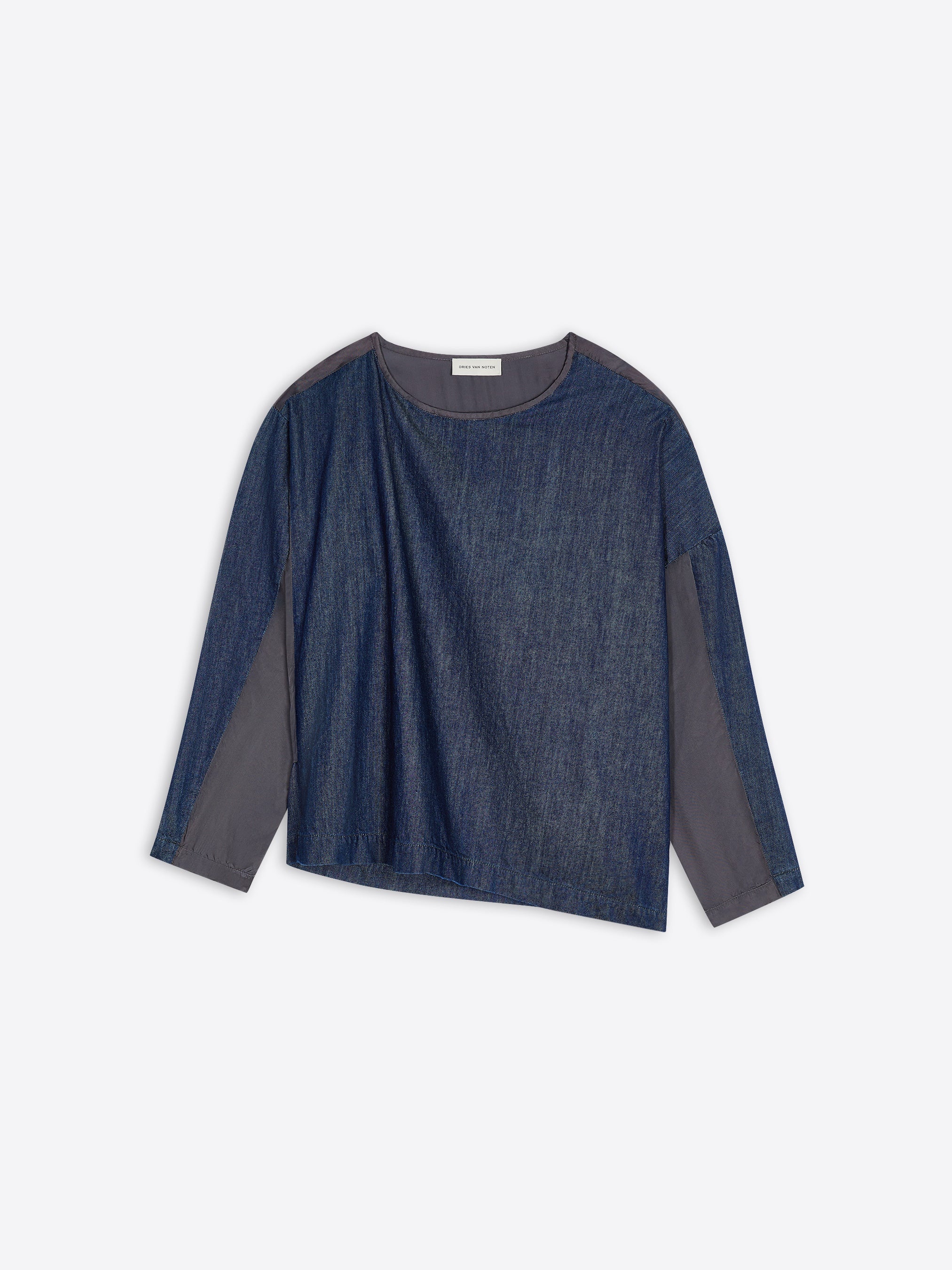 Loose fit asymmetrical top in lightweight rinsed indigo denim, with contrast panels. DETAILS - 50% Cotton, 50% Viscose. - Contrast panels. - Loose fit. Asymmetrical. Long sleeves. Round neckline. - Ref: 251-010727-1553 SIZE AND FIT Model is 179 cm / 70.5 inches and wears size 38.