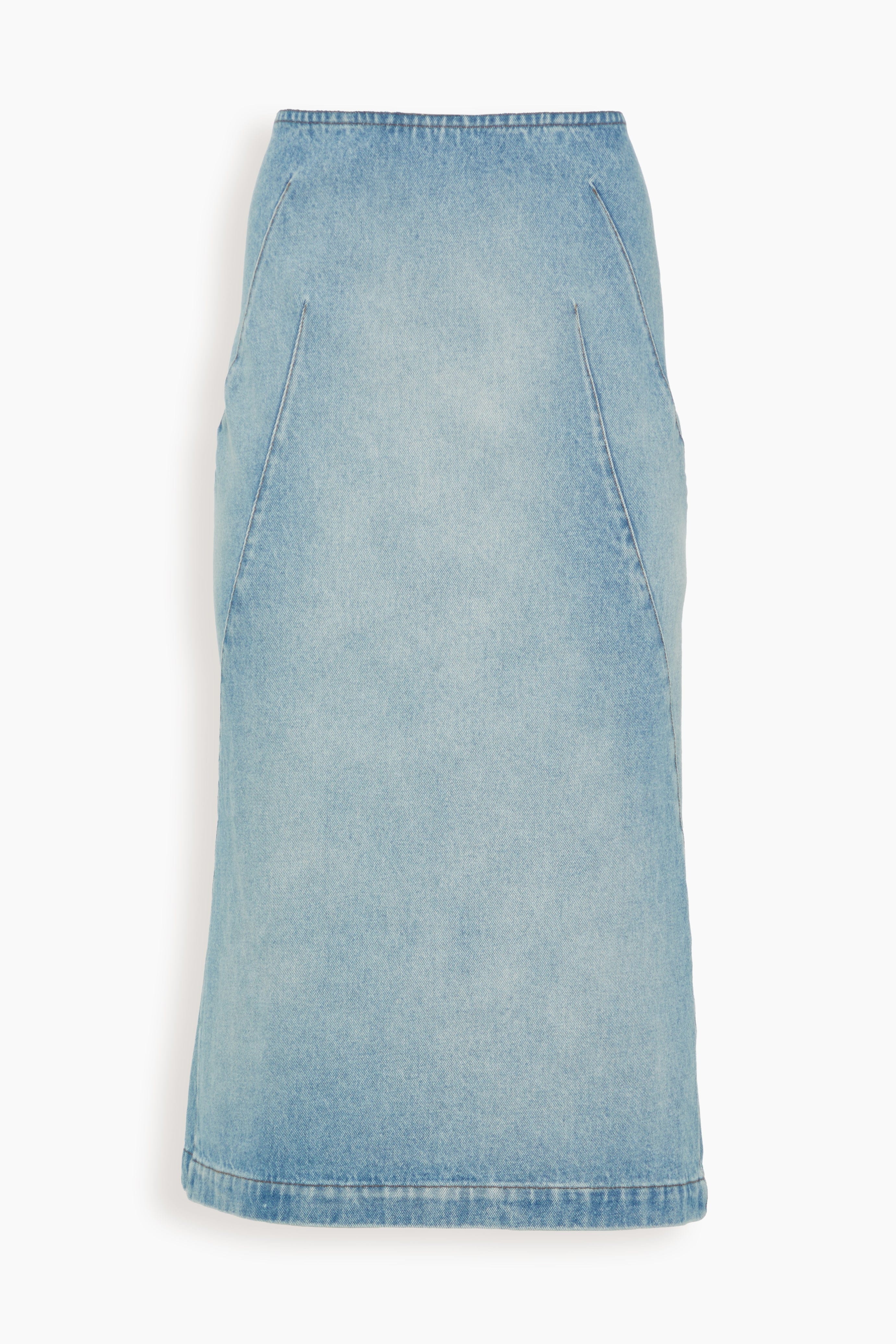The Dries Van Noten Sibyl Denim Skirt in Light Blue is a midi skirt with godet flared hem and seaming dart details at the sides. FIT DESCRIPTION MODEL MEASUREMENTS - Fits true to size, take your normal size - Concealed back zip closure - 100% Cotton - Celeste is wearing a size 34/ 2 US - Bust: 35" - Waist: 25.5" - Hips: 34" - Height: 5’10”