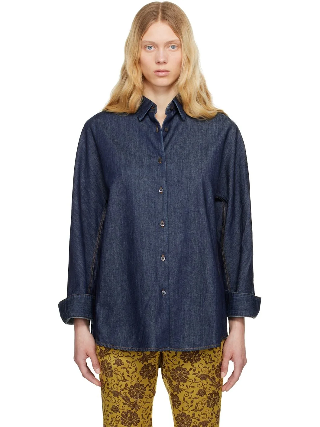 Non-stretch denim shirt. · Spread collar · Button closure · Shirttail hem · Adjustable buttoned barrel cuffs · Contrast stitching in tan Supplier color: Indigo 100% cotton. Made in Tunisia 251358F109010