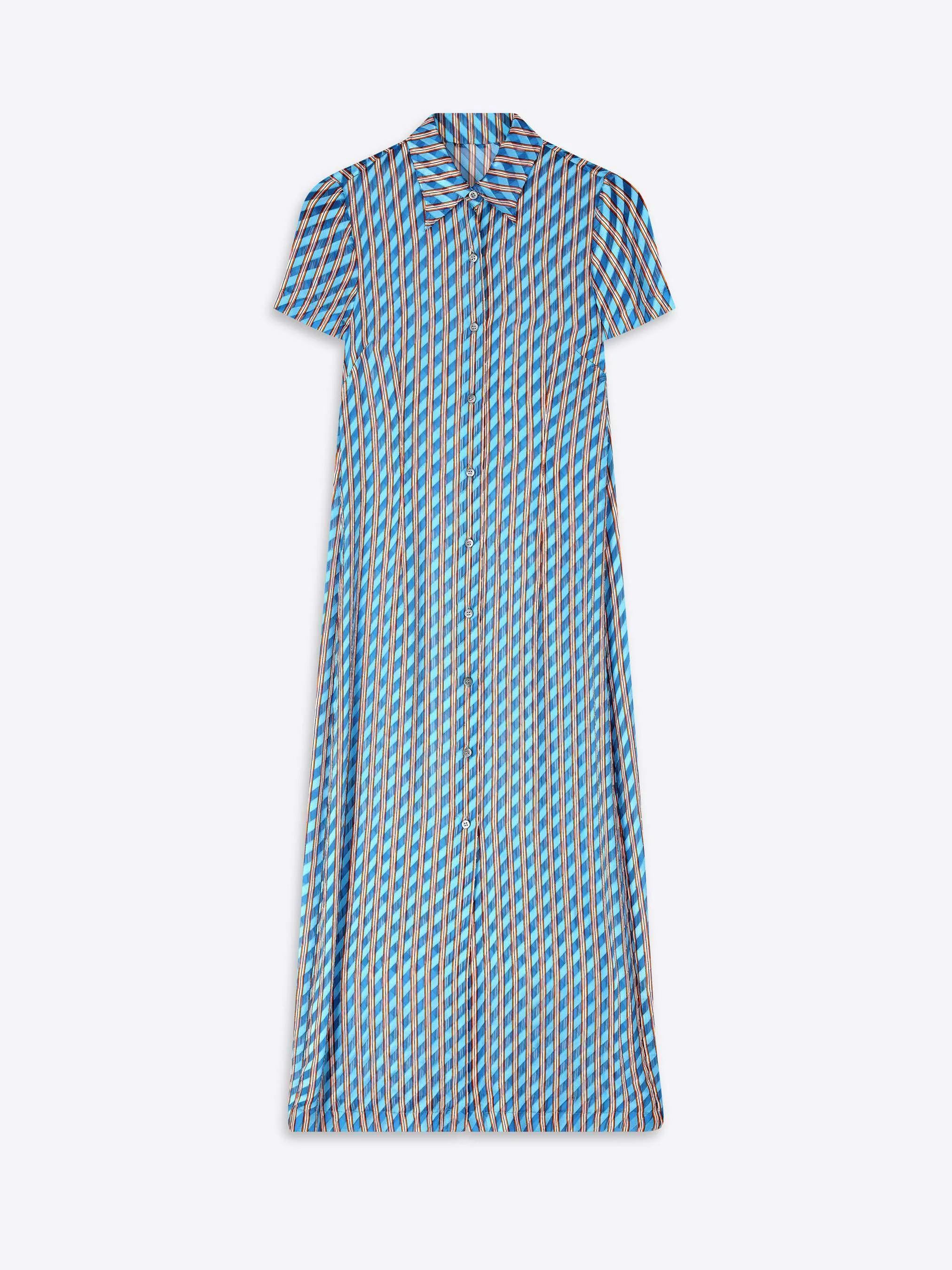 Tight fit short-sleeved shirt dress, in viscose and silk devore with diagonal stripe pattern. DETAILS - 60% Viscose, 40% Silk. - Diagonal stripe pattern. - Tight fit. Calf length. Short sleeves. Classic collar. Front button closure. - Ref: 261-131005-3149 SIZE AND FIT Model is 178 cm / 70 inches and wears size 36.
