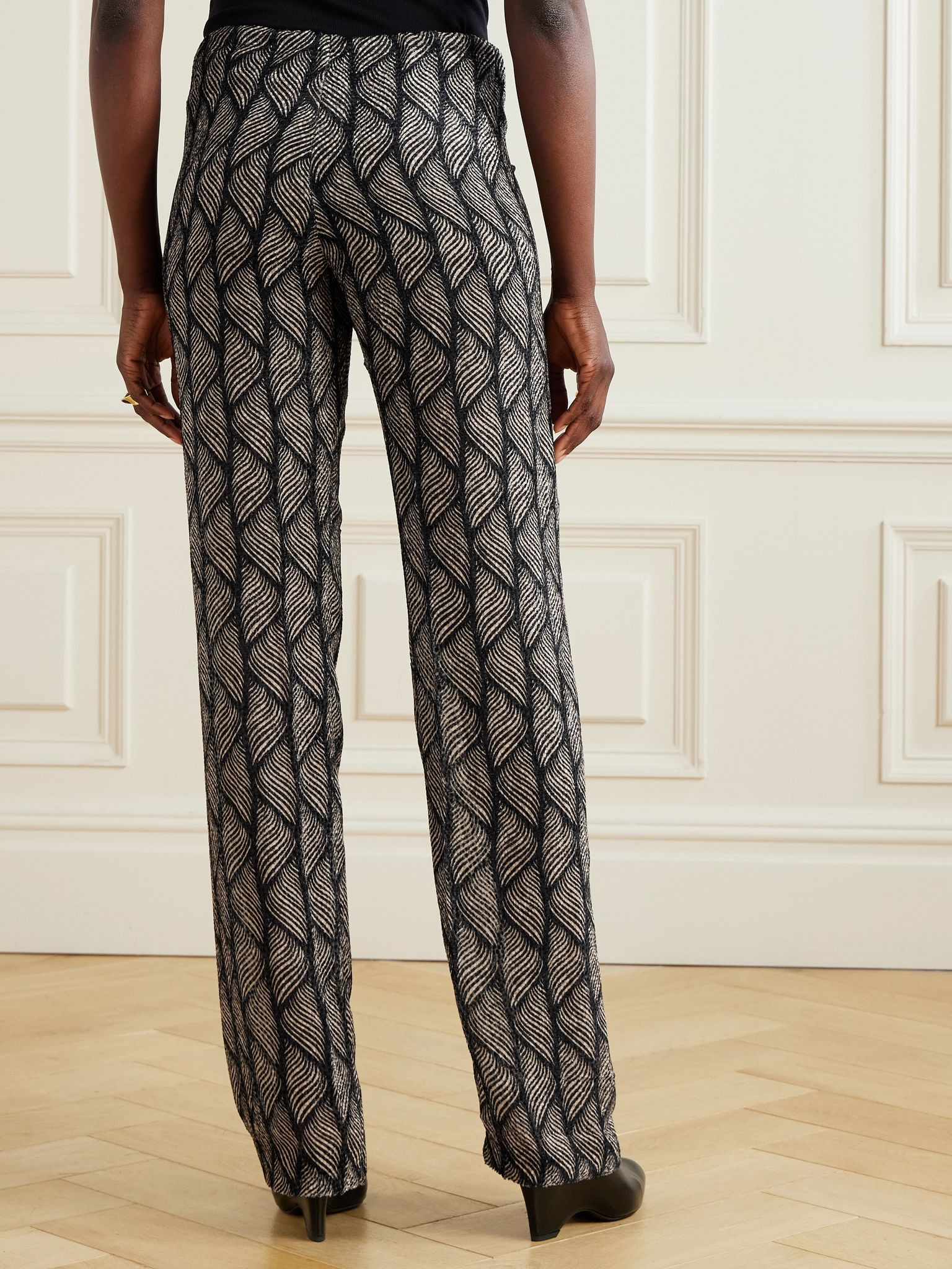 Dries Van Noten's pants are made from devore-velvet – the wavy design really draws the eye. They're fitted with an elasticated drawstring waistband and have straight legs with floor-skimming cuffs. Wear yours with a plain blouse or tee. Size & Fit - Fits true to size, however those who are between sizes should take the larger size - Mid-rise, intended for a straight-leg fit - Lightweight, non-stretchy fabric - Model is 177cm/ 5'10" and is wearing a FR 36 Model measurements: - Bust: 80cm/ 31.5" - Waist: 60cm/ 23.5" - Hip: 89cm/ 35" Details & Care - Taupe and black devore-velvet - Pulls on - 58% viscose, 42% silk