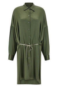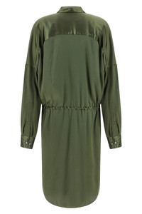 cod. 2520110832032606 'Dinidia' silk satin dress, shirt style with shirt collar and front button closure, adjustable drawstring at the waist, long sleeves with cuffs. Color: Green Size & Fit: True to size fit Composition: 94% silk 6% elastane Made in: Poland