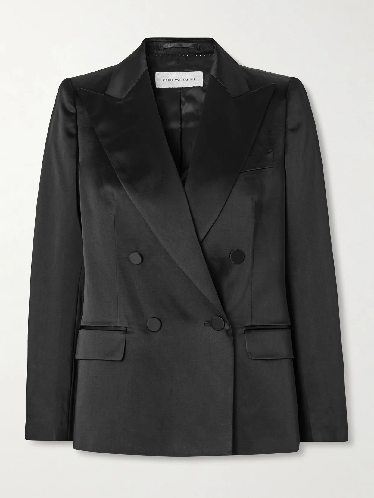 Impeccable tailoring is central to Dries Van Noten's DNA, making this blazer a long-term staple with lasting impact. It's cut from lustrous washed cotton-blend satin for an elevated feel and has a slim-fit, double-breasted design with peak lapels that draw the eye to the padded shoulders. The full lining ensures smooth layering.