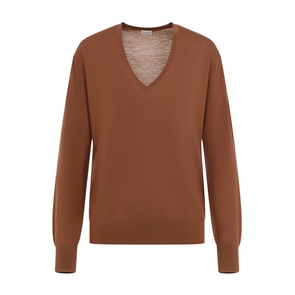 Stay cozy and chic in this luxurious brown sweater from Dries Van Noten. Crafted from 100% merino wool, this stylish piece is perfect for elevating your wardrobe with sophistication and style. Key attributes: Brown | Light Rust | 100% Merino Wool | V-neck | Dimensions & fit: Regular fit | Composition & care: 100% Merino Wool | Dry clean only Designer color: Brown Designer ID: 2420112029700 700 LIGHT RUST Material & Care 100% Merino Wool