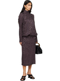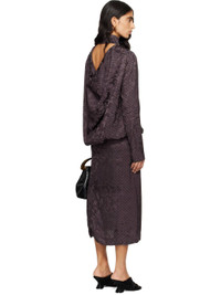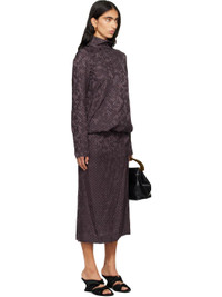 Viscose satin midi dress. · Graphic pattern printed throughout · Mock neck · Button fastening at collar · Gathering at waist · Concealed zip closure at side seam · Draping at back · Central vent at back hem · Full satin lining Supplier color: Brown Body: 100% viscose. Lining: 100% viscose. Made in Bulgaria 252358F054018