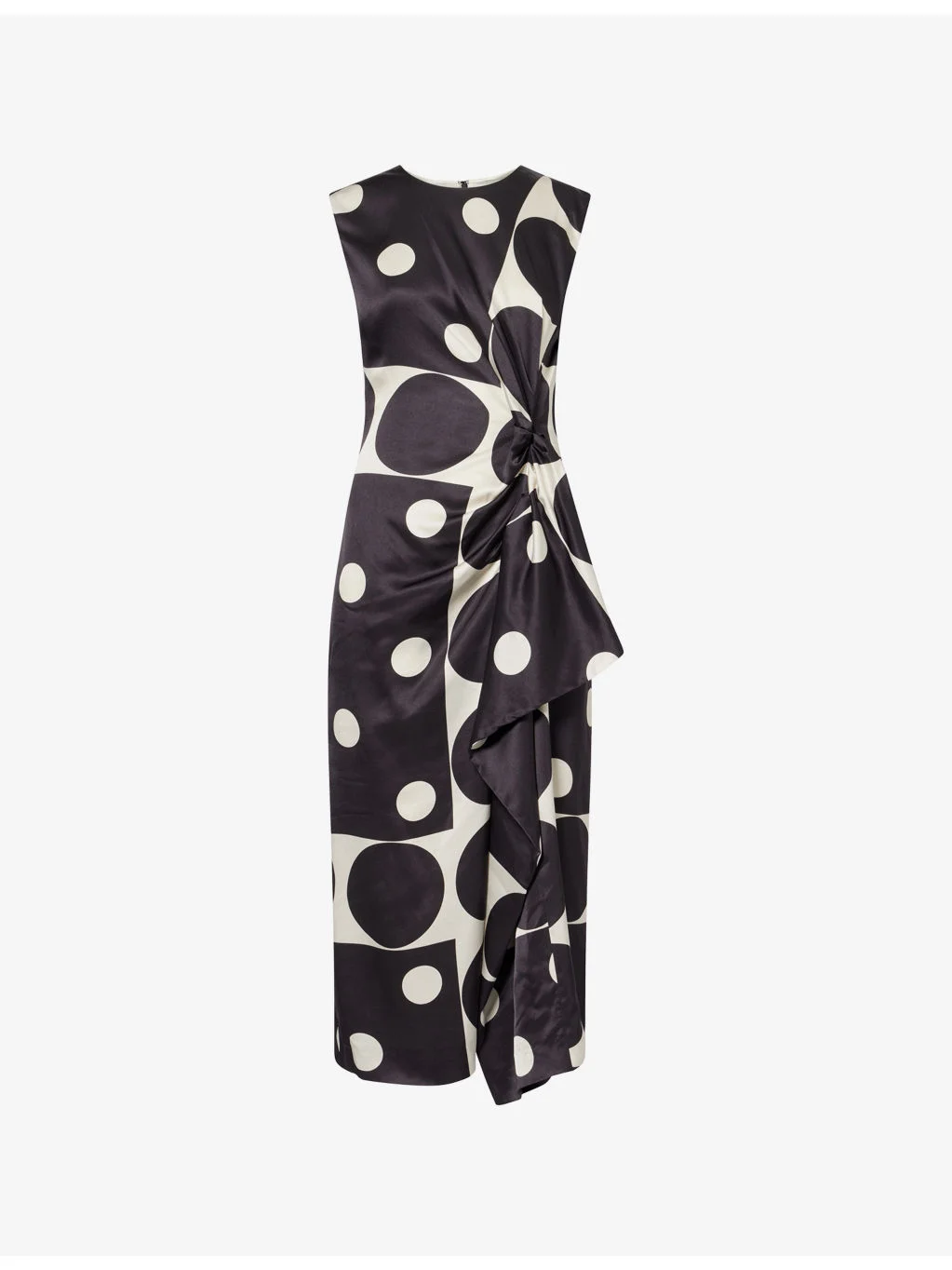 PRODUCT DETAILS - Dries Van Noten satin midi dress - 100% viscose - Concealed zip fastening at back - Regular fit, round neck, sleeveless, draped knotted waist, all-over monochrome polkadot print, fully lined - Dry clean - Made in Poland - True to size - Size UK 8: length 48in / 22cm - Model is 5ft 10in/1.78m and wears a size UK 8 - Lightweight, non-stretch Ref: R04602604