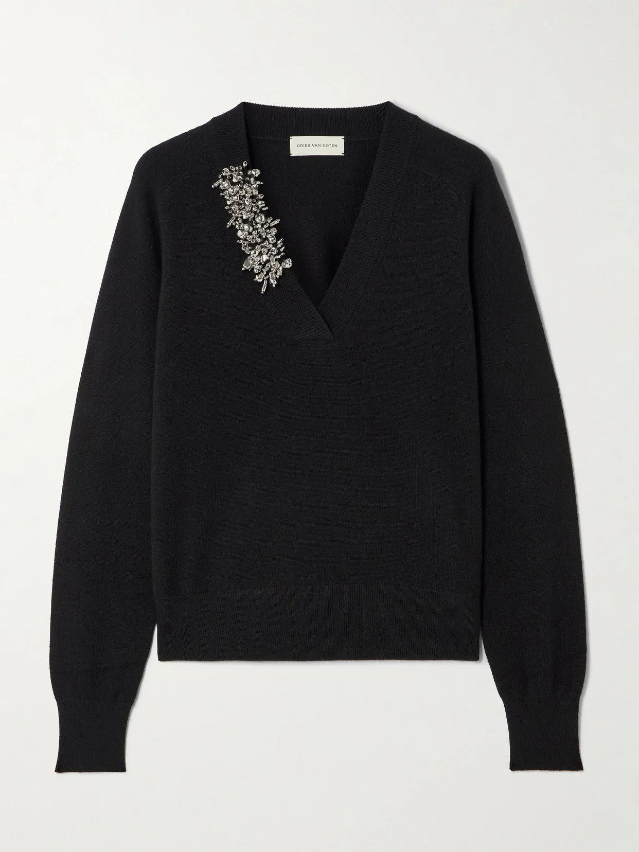 Dries Van Noten's sweater is embellished with clusters of silver-tone beads along the V-neckline, lending a glamorous touch to the otherwise classic design. It's made from sumptuous cashmere and has a slim shape defined by ribbed trims. Wear yours with a pencil skirt and heels.