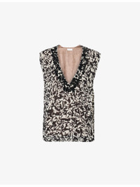 PRODUCT DETAILS - Dries Van Noten woven top - 100% viscose; lining 100% silk - Regular fit, V-neck, sleeveless, all-over abstract print, all-over sequin embellishment, crepe texture, fully lined - Dry clean - True to size - Model is 5ft 10in/1.78m and wears a size UK 8 - Lightweight, stretchy Ref: R04557788