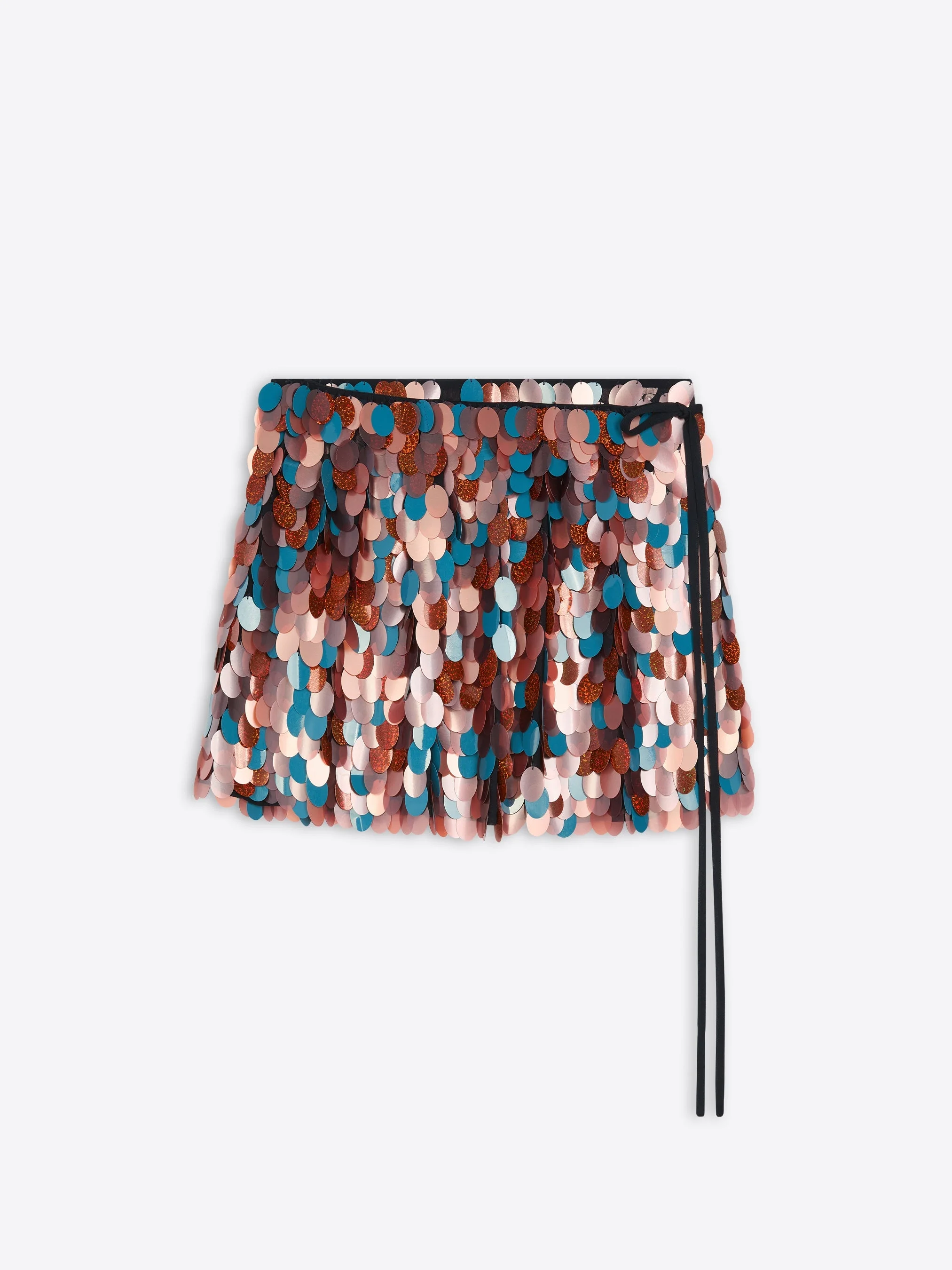 Mini wrap skirt in viscose with side tie closure, with allover sequin embroidery. DETAILS - 100% Viscose. - Allover sequin embroidery. - Side tie closure. - Ref: 252-010602-2317 SIZE AND FIT Model is 178 cm / 70 inches and wears size 36.