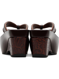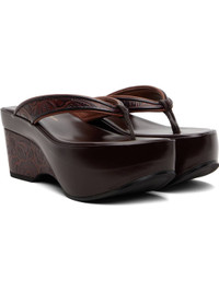Buffed leather heeled sandals. · Open toe · Thong-style strap at vamp · Embossed floral pattern at strap and wedge heel · Logo embossed at padded footbed · Platform midsole · Rubber sole · Platform: H2.25" · Heel: H2.25" Supplier color: Dark Brown Upper: leather. Sole: rubber. Made in Italy 261358F125004