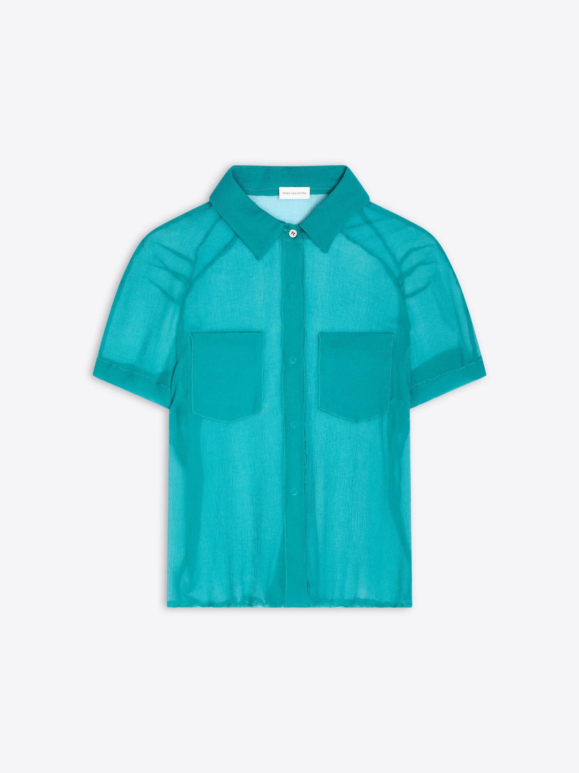 Tight fit mini shirt in muslin silk, with short raglan sleeves and hidden front button closure. DETAILS - 100% Silk. - Tight fit. Cropped. Short sleeves. Classic collar. Chest patch pockets. Front hidden button closure. - Ref: 261-010704-3040 SIZE AND FIT Model is 178 cm / 70 inches and wears size 34.