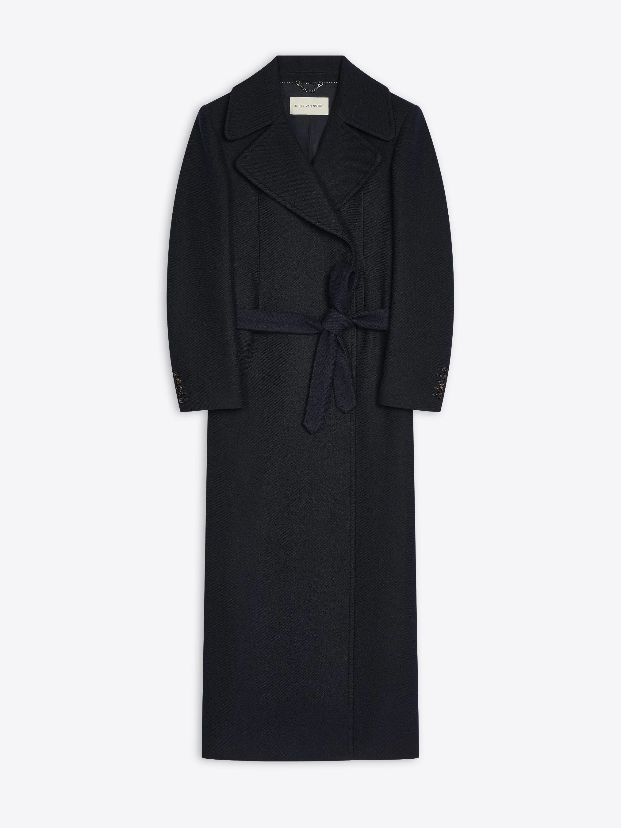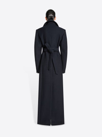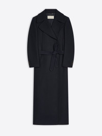 Floor-length coat with constructed padded shoulders and nipped waist, in wool twill. DETAILS - 70% Wool, 30% Nylon. Lining: 55% Cotton, 45% Cupro. - Loose fit. Floor length. Padded shoulders. Front slit pockets. Buttoned cuffs. Belted. Nipped waist. Hidden front button closure. - Ref: 252-010246-2216 SIZE AND FIT Model is 178 cm / 70 inches and wears size 36.