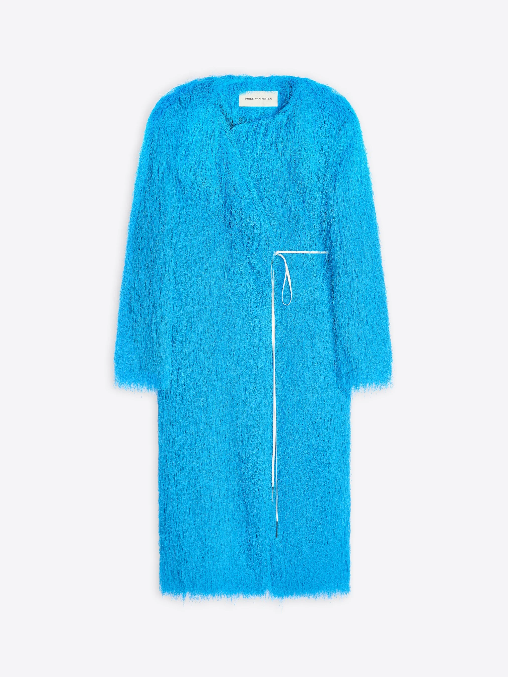 Long collarless coat in lightweight fringed fabric, with drawstring closure. DETAILS - 100% Polyester. - Lightweight fringed fabric. - Regular fit. Lined. Side slit pockets. Front tie closure. - Ref: 261-010262-3038 SIZE AND FIT Model is 178 cm / 70 inches and wears size M.