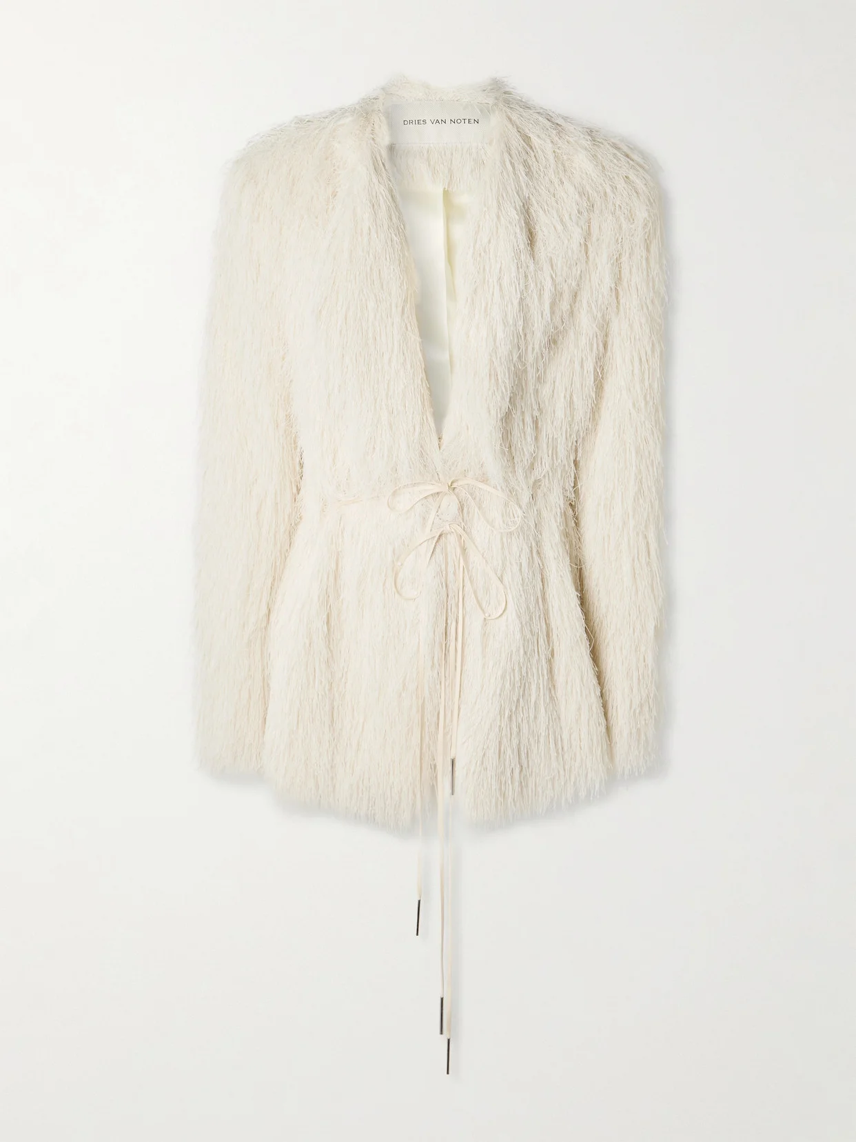 Dries Van Noten's Fall '25 collection celebrates "elegance from other eras in the key of today." Reminiscent of 1920s flapper style, this jacket has a wrap shape and is covered with frothy fringing. It was worn on the runway with the matching dress for a double dose of texture.
