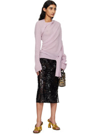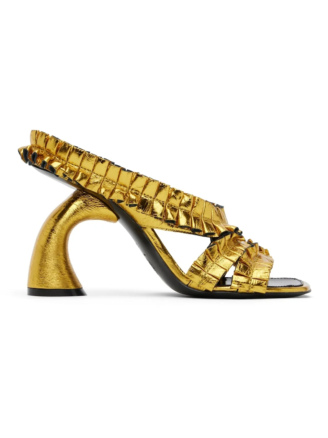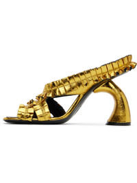 Cracked leather heeled sandals in metallic gold tone. · Ruffled trim throughout · Open square toe · Logo printed at padded leather footbed · Covered sculptural heel with rubber injection · Leather sole · Heel: H3" Supplier color: Gold Upper: leather. Sole: leather, rubber. Made in Italy 251358F125009
