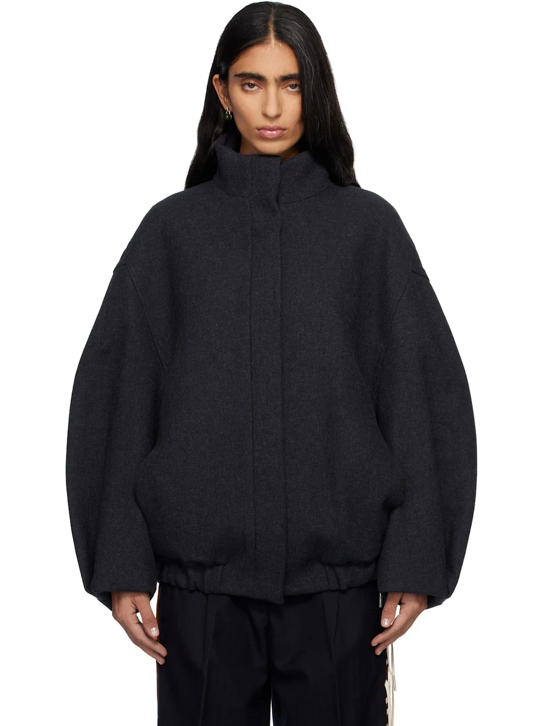 Cotton-blend delaine coat. · Stand collar · Zip closure · Seam pockets at waist · Elasticized hem · Dropped shoulders · Pleats at cuffs · Full satin lining Supplier color: Dark grey Body: 38% cotton, 30% polyester, 20% acrylic, 10% wool, 2% other fibers. Lining: 64% viscose, 36% cotton. Made in Bulgaria 252358F063007