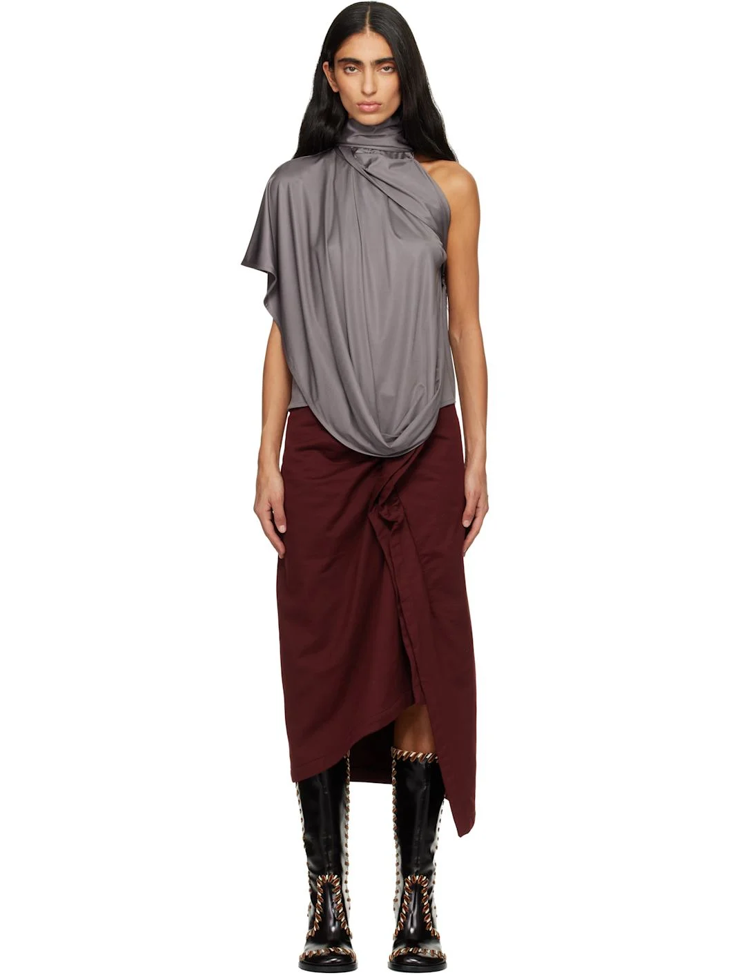 Viscose jersey top. · Asymmetrical construction · Integrated scarf at turtleneck · Draping at front · Concealed zip closure at back Supplier color: Dark grey 100% viscose. Made in Portugal 252358F111001
