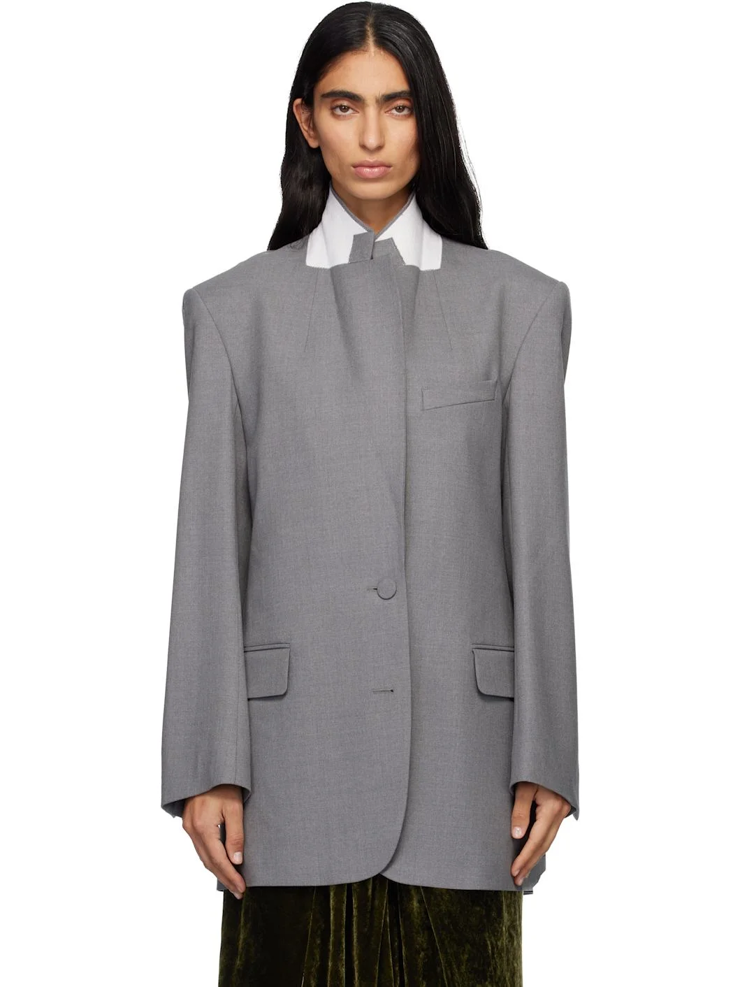 Oversized stretch wool twill blazer. · Notched lapel · Button closure · Welt pocket at chest · Flap pockets at waist · Padded shoulders · Vent at cuffs and side seams · Full satin lining Supplier color: Grey Body: 93% wool, 7% elastane. Lining: 100% viscose. Made in Morocco 252358F057001