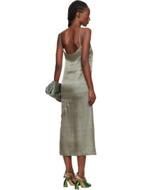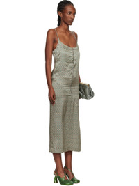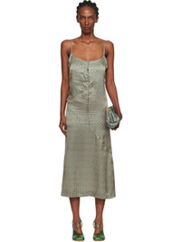 Silk satin midi dress. · Scoop neck · Adjustable spaghetti shoulder straps · Diagonal seam at skirt · Vented lower side seam · Buttoned fastening at back collar · Unlined Supplier color: Steel 100% silk. Made in Tunisia 252358F054014