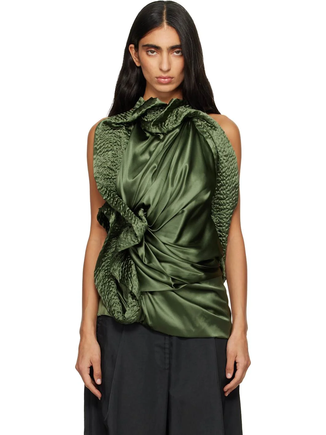 Stretch silk satin blouse. · Asymmetrical construction · Draping and quilted trim throughout · Self-tie halter neck fastening at side seam · Concealed zip closure at side seam Supplier color: Khaki 94% silk, 6% elastane. Made in Poland 252358F107002
