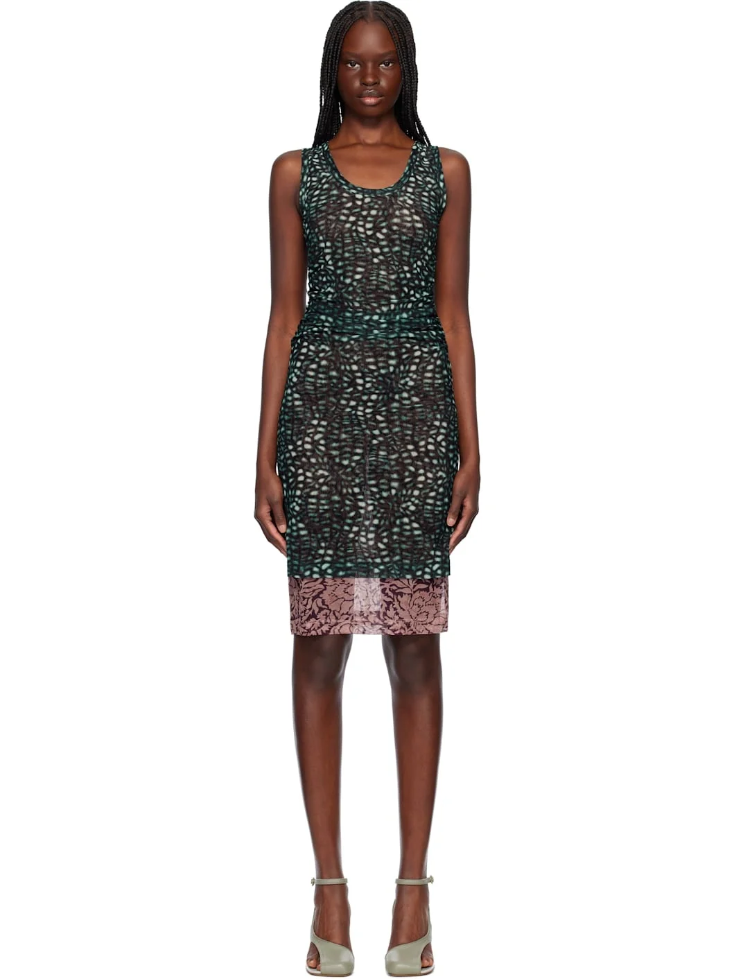 Semi-sheer stretch nylon mesh midi dress. Graphic pattern printed throughout. · Layered construction · Rib-knit scoop neck and armscyes · Ruching at side seams and back Supplier color: Malachite 94% polyamide, 6% elastane. Made in Turkey 251358F054020