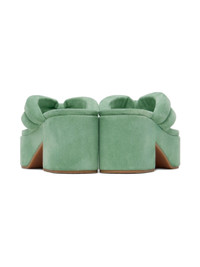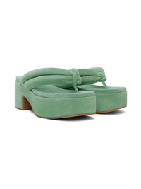 Suede slip-on heeled sandals in green. · Open square toe · Padded thong-style strap at vamp · Logo stamp at padded footbed · Covered block heel · Covered platform midsole · Crepe rubber sole · Platform: H1.5" · Heel: H2.75" Supplier color: Turquoise