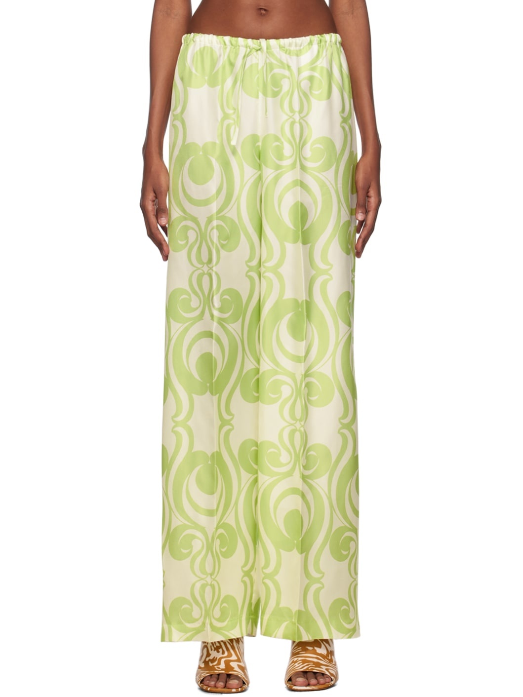 Silk twill trousers. Graphic pattern printed throughout. · Drawstring at elasticized waistband · Creased legs Supplier color: Light green