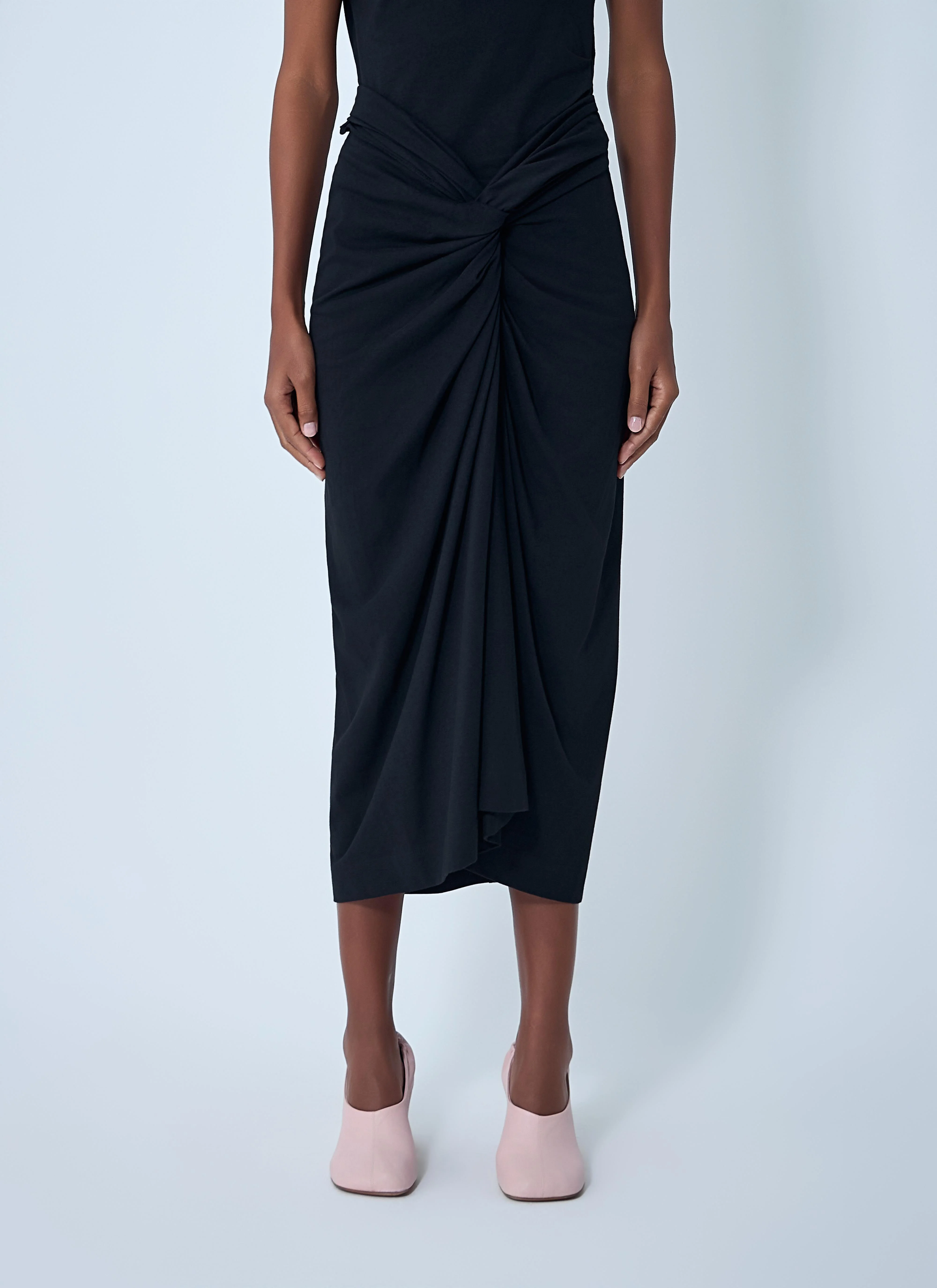 Midi skirt with a ruched crossover construction. - Mid rise - Front ruched construction - 100% Cotton. Machine wash cold - Color: Black - Code: 252-011112-2603-900
