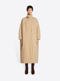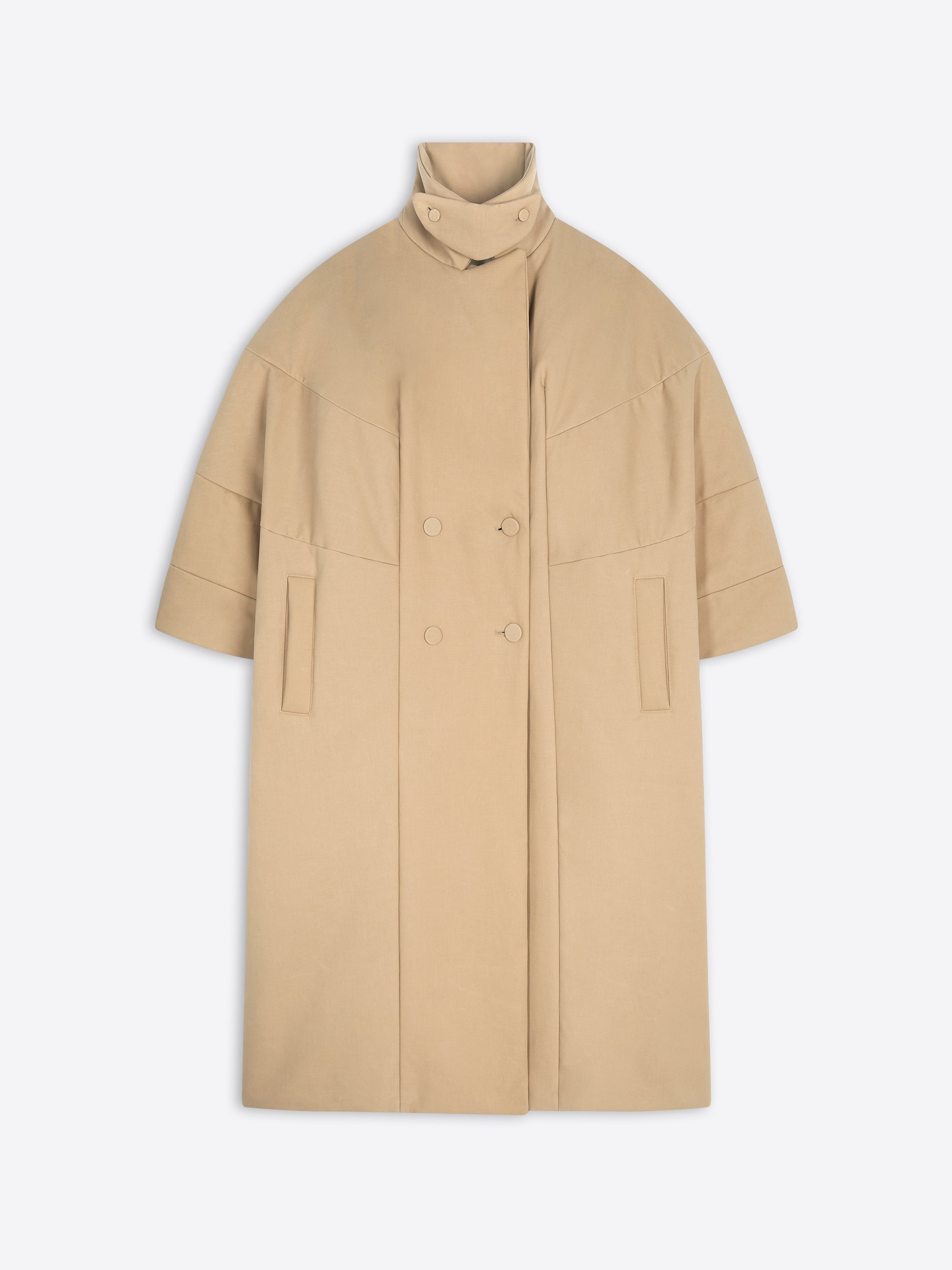 Long cocoon shaped coat with 3/4 sleeves and seams details, in double-weaved cotton toile. DETAILS - 97% Cotton, 3% Elastane. - Water repellent. - Oversized fit. 3/4 sleeves. Lined. High collar. Front slit pockets. Front button and collar closure. - Ref: 242-010211-9129 SIZE AND FIT Model is 179 cm / 70.5 inches and wears size M.